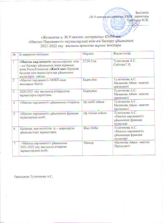 Мектеп Парламентінің жоспары